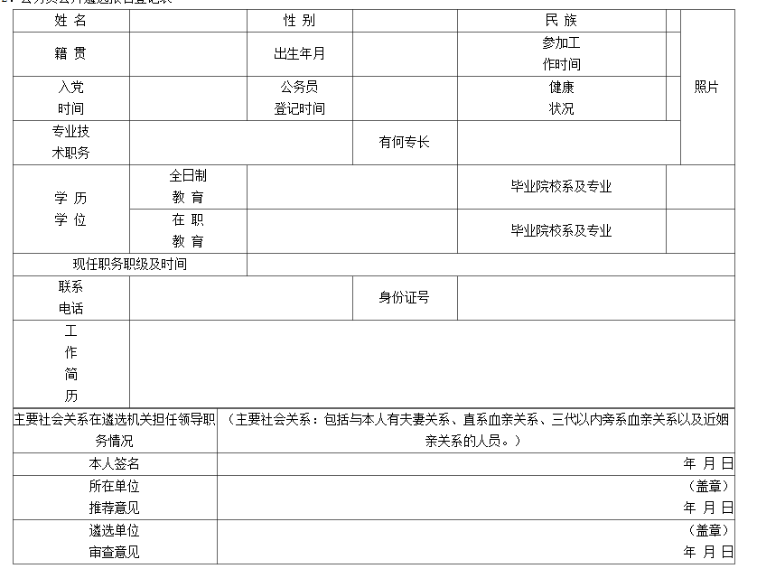 2. 現(xiàn)場報名:本次公開遴選采取現(xiàn)場報名方式進(jìn)行,本人因故不能到場,可以書面委托他人現(xiàn)場報名,并提供報名所需資料:①《公務(wù)員公開遴選報名登記表》(附件2);②身份證、學(xué)歷證書原件及復(fù)印件;一寸近期免冠彩色照片2張;提供畢業(yè)證近期學(xué)信網(wǎng)驗證的《教育部學(xué)歷證書電子注冊備案表》紙質(zhì)檔一份(含二維碼格式);③本年度體檢報告(含涉毒毛發(fā)檢測項目);④原單位同意報考證明。