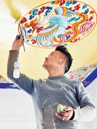 3月28日是西藏百萬(wàn)農(nóng)奴解放紀(jì)念日。在西藏自治區(qū)日喀則市南木林縣卡孜鄉(xiāng)湘河水庫(kù)移民新村,129戶、685人慶祝喜遷新居。位于南木林縣境內(nèi)的湘河水利樞紐及配套灌區(qū)工程是國(guó)務(wù)院確定的172項(xiàng)重大水利工程之一,也是改善環(huán)境、發(fā)展生產(chǎn)、提高群眾生活水平的民生工程。圖為2022年3月27日,來(lái)自日喀則的民間藝人在湘河水庫(kù)移民新村一處民居繪制屋頂。新華社記者張汝鋒/攝