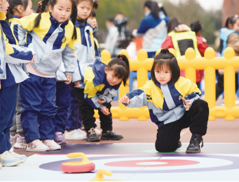 讓老百姓過(guò)上好日子,持續(xù)保障改善民生。圖為2022年2月16日,安徽省合肥市泰山路幼兒園的小朋友在開學(xué)典禮上體驗(yàn)“旱地冰壺”游戲。新華社記者周牧/攝