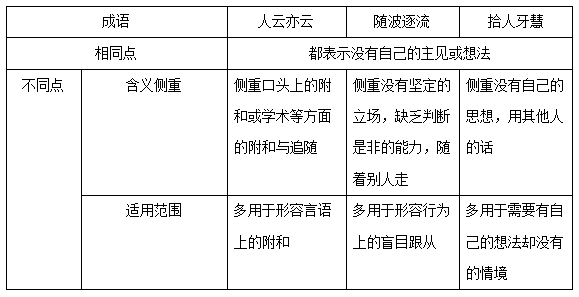 接下來,通過表格的方式來對以上三個成語進(jìn)行差異辨析。