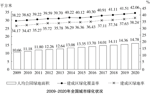B.以2009年為基期計(jì)算,2009—2020年城市建成區(qū)綠地率年均上升0.4個(gè)百分點(diǎn)以上