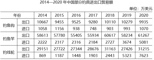 B.2014—2020年,每年釣魚(yú)鉤進(jìn)出口總額都超過(guò)1億美元
