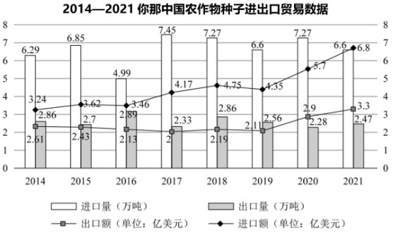 111.2014—2021年間,我國(guó)農(nóng)作物種子進(jìn)出口貿(mào)易逆差超2億美元的年份有幾個(gè):( )