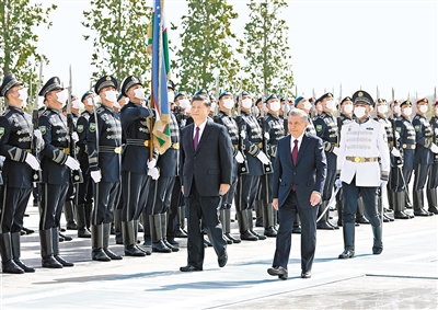當(dāng)?shù)貢r間9月15日,國家主席習(xí)近平在撒馬爾罕同烏茲別克斯坦總統(tǒng)米爾濟(jì)約耶夫會談。會談前,米爾濟(jì)約耶夫?yàn)榱?xí)近平舉行隆重歡迎儀式。新華社記者申宏攝