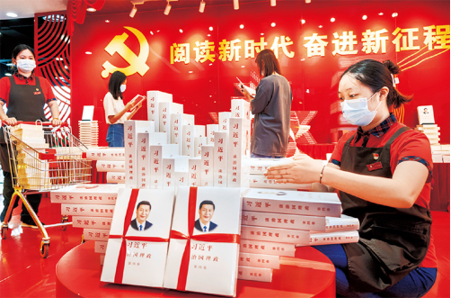 在全黨全社會(huì)喜迎黨的二十大勝利召開之際,《習(xí)近平談治國(guó)理政》第四卷出版發(fā)行。圖為2022年7月3日,重慶市渝中區(qū)重慶書城黨建讀物專區(qū),工作人員正在專架上陳列《習(xí)近平談治國(guó)理政》第四卷。重慶日?qǐng)?bào)記者張錦輝/攝