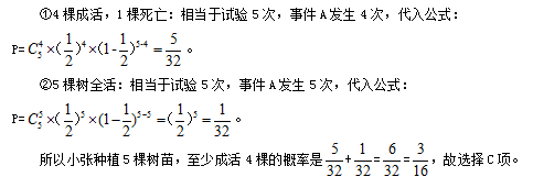例1:植樹節(jié)期間,某單位購進一批樹苗,在林場工人的指導下組織員工植樹造林。假設樹苗的成活率為50%,那么,該單位職工小張種植5棵樹苗,至少成活4棵的概率是多少?( )