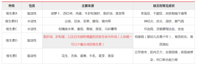 從表格中我們能夠看出來,當我們?nèi)梭w缺乏維生素的時候會產(chǎn)生很多不良的影響,所以在日常生活當中,我們需要注意對各種維生素的攝取。那么,我們攝取維生素的主要方式就是通過吃富含維生素的食物,所以我們應多加注意每日的飲食,保證營養(yǎng)攝取均衡。