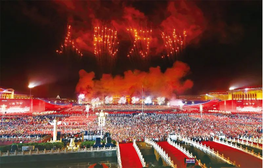 2019年10月1日晚,慶祝中華人民共和國成立70周年聯(lián)歡活動在北京天安門廣場盛大舉行。圖為絢麗煙花排列出了“人民萬歲”的字樣。新華社記者蘭紅光/攝