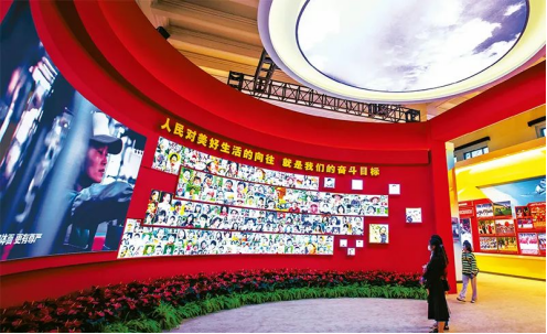 2022年9月27日,“奮進新時代”主題成就展在北京展覽館開幕。展覽緊扣“奮進新時代”這一主題,以黨的十八大以來以習近平同志為核心的黨中央治國理政為主線,聚焦新時代10年黨和國家事業(yè)的偉大成就、偉大變革。圖為中央展區(qū)中的笑臉墻。劉新武/攝