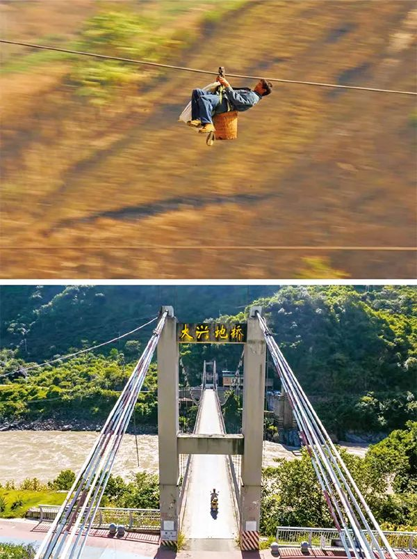 “過江靠溜索”曾是怒江兩岸群眾出行的重要方式。2013年,國家實施“溜索改橋”項目,幫助西部邊遠山區(qū)群眾結束溜索時代,怒江州怒江段上溜索被改造為各式跨江橋梁,完成了沿江人民“天塹變通途”的企盼。上圖為2013年2月2日,在云南省怒江州瀘水市六庫街道,一名居民背著背簍溜索過江(新華社記者王長山/攝)。下圖為2022年9月13日,瀘水市居民騎摩托車通過大興地橋(無人機照片,新華社記者江文耀/攝)。