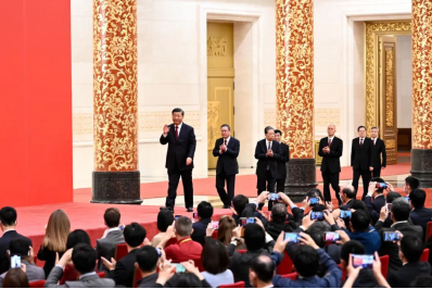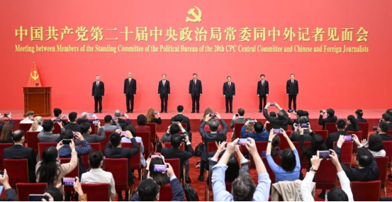 剛剛在二十屆一中全會(huì)上當(dāng)選的中共中央總書(shū)記習(xí)近平和中共中央政治局常委首次集體亮相,同采訪(fǎng)二十大的中外記者親切見(jiàn)面。