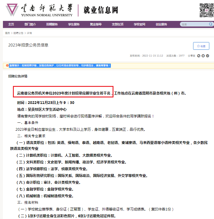 近日,云南師范大學就業(yè)信息網(wǎng)發(fā)布的一則“2023年招錄公務員信息”,是關(guān)于云南省公務員2023年度招錄應屆畢業(yè)生計劃。詳情如下: