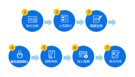 報(bào)名注冊 → 上傳照片 → 填報(bào)信息 → 報(bào)名信息確認(rèn) → 資格審核 → 網(wǎng)上繳費(fèi) → 報(bào)名完成。