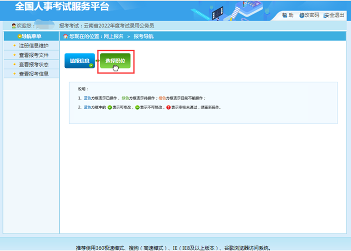 2.報考者應(yīng)認(rèn)真了解基本的政策和要求,仔細(xì)閱讀《招考簡章》,結(jié)合自身條件,慎重選擇適合自己的招考職位。職位提交前請確認(rèn)個人信息是否按本人實際情況準(zhǔn)確填寫,如個人信息填寫與本人實際情況不一致需要修改,點擊“查看報考狀態(tài)”“信息維護(hù)”按鈕進(jìn)行修改。一旦進(jìn)行“報名信息確認(rèn)”操作后,將不能再修改報名信息和報考職位。