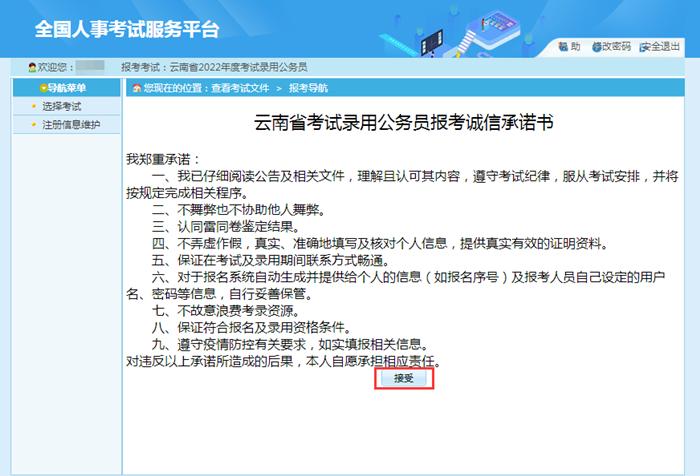 報考者登錄后,閱讀“報考須知”頁面,閱讀完“報考須知”后點擊“接受”后進(jìn)入“報考者承諾書”,閱讀并接受“報考者承諾書”后進(jìn)入“填寫個人信息”。