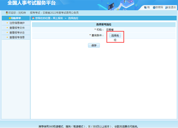 報考者填寫個人信息完成點擊“保存”,提示保存成功后,跳轉(zhuǎn)到報考流程頁面。點擊“選擇職位”選項,跳轉(zhuǎn)到選擇報考職位界面,報考者可以點擊“選擇職位”按鈕,通過樹形菜單選擇對應(yīng)的職位,選擇對應(yīng)的職位后,系統(tǒng)會提示報考該職位所需的條件,選擇相應(yīng)的職位,點擊“保存”按鈕,提示保存成功后,跳轉(zhuǎn)到報考流程頁面。