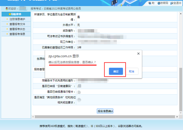 1.只有在“報名信息確認(rèn)”頁面點擊“確認(rèn)”按鈕后,才將個人報考信息提交至招考部門,如未完成“報名信息確認(rèn)”操作,報名過程未全部完成,招考部門將無法看到報考者信息,無法進(jìn)行資格審查。