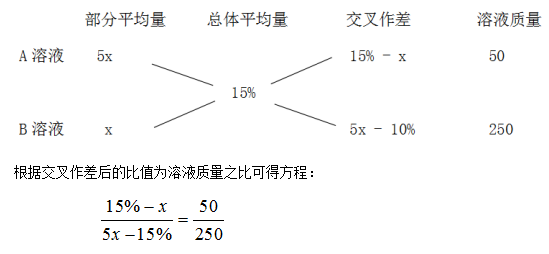 難度較低的題目只需要通過(guò)以上幾個(gè)公式列方程即可求解,那么在考試中如果遇到溶液混合這類難以下手的問(wèn)題,同學(xué)們還可以采用十字交叉法來(lái)快速求解。