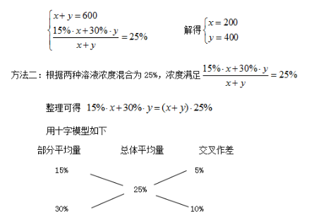 通過(guò)這個(gè)例子,我們不難發(fā)現(xiàn),方程法在列式及求解的過(guò)程中,計(jì)算量相對(duì)較大,而通過(guò)十字交叉法簡(jiǎn)單畫(huà)圖就可以快速得出結(jié)果,列式步驟較少、計(jì)算量較少。因此,同學(xué)們可以在今后做題時(shí)采用十字交叉法快速解決此類問(wèn)題。