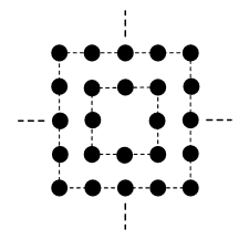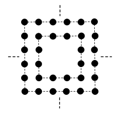 正中間有四個(gè)人的正方形陣列掏去中間若干層,如下圖所示為掏去中間一層,任意一層每邊人數(shù)n為偶數(shù)。