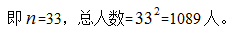 【答案】C【解析】最外層人數(shù)為128人,即最外層每邊人數(shù)×4-4=128,計(jì)算可知最外層每邊人數(shù)=33,