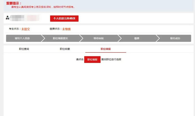 在填報具體職位信息前,考生需要先完善自己的報名信息,點擊姓名右側(cè)的個人信息完善/修改按鈕。注意,報考的職位審核通過后個人信息將不能再修改,因此建議大家填寫完畢后仔細(xì)檢查再進(jìn)行報考。