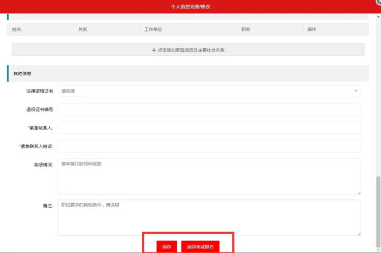 個人信息填寫完畢后,記得點擊保存后再返回考試報名,如直接返回報名的話個人信息無法保存,還需重新填寫。