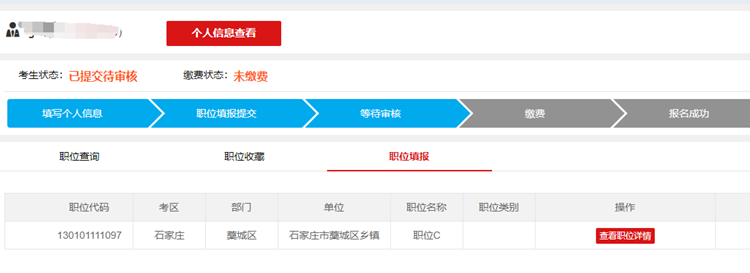 個人信息完成后進(jìn)行職位填報提交,篩選出適合自己的崗位進(jìn)行我要選報。
