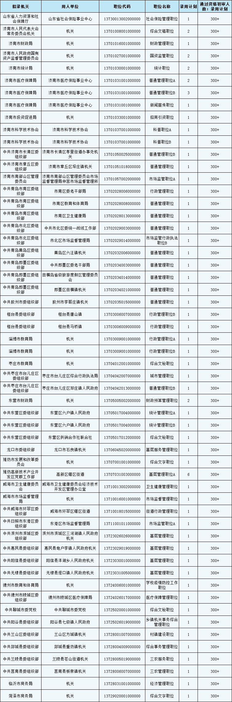 2023年山東公務(wù)員考試報名已結(jié)束,截至11月23日16時,300+的崗位有56個,100+的崗位有623個,50+的崗位有1209個,30+的崗位有984個,3+的崗位有2745個,3-的崗位有71個,具體數(shù)據(jù)詳見附件: