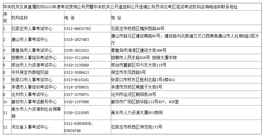 中央機關(guān)及其直屬機構(gòu)2023年度考試錄用公務員暨中央機關(guān)公開遴選和公開選調(diào)公務員河北考區(qū)筆試考試機構(gòu)咨詢電話和聯(lián)系地址