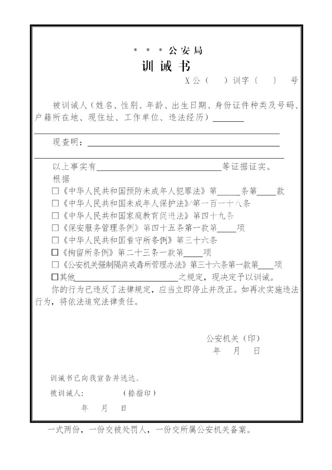 公安機關訓誡法律依據(jù)及《訓誡書》式樣(最新)