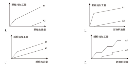 【答案】A【解析】A2曲線:若想要新糧加工量最少,需要先加工舊糧,說明A2必須有一段縱軸值為0的橫線,排除C項;A1曲線:若想要新糧加工量最多,則需要先加工新糧,舊糧Y是不變量,不存在周期性,排除D;觀察A、B選項,區(qū)別在于A1曲線第一段的斜率,代表的是盡量多的使用新糧的起始階段,此時應該全部使用新糧,斜率為1,A項符合。故選A。