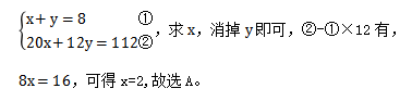 方法二,如果8天全是雨天,可運12×8=96次,比實際少運了112-96=16次。每多一個晴天比一個雨天多運20-12=8次,則運送期間經歷的晴天有16÷8=2天,故本題選A。