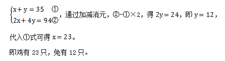 例1:有若干只雞兔同在一個籠子里,從上面數(shù),有35個頭;從下面數(shù),有94只腳。求籠中各有幾只雞和兔?