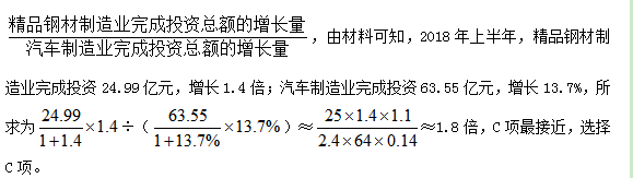問題:2018年上半年,上海市工業(yè)六個重點發(fā)展行業(yè)中精品鋼材制造業(yè)完成投資總額同比增量約是汽車制造業(yè)的多少倍?( )