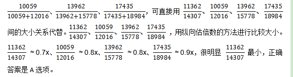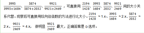 第三步選取合適的方法計算比較。想要計算得既快又準,一方面要在計算比較前注意觀察選項差距,根據(jù)選項的差距來選擇合適的計算比較方法,另一方面要對常用的計算比較方法爛熟于心,更重要的是要在平時勤加練習,不斷提高自己的基本計算比較能力。