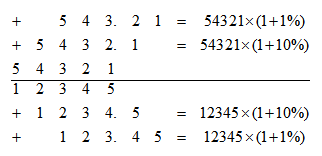 上式中,當(dāng)分母加上1234.5相當(dāng)于將分母擴(kuò)大為(1+10%)倍,則分子也要擴(kuò)大相同的倍數(shù),則相當(dāng)于在分子上加了5432.1。同理,如果分母上加123.45則分子上加543.21。