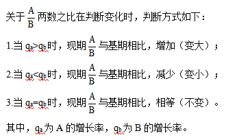 形式的列式我們統(tǒng)稱為兩數(shù)之比,常考的有比重、平均數(shù)以及倍數(shù),還有收入利潤率、產(chǎn)銷率等等。當(dāng)我們已知分子分母的增長率的大小關(guān)系時,就可以直接判斷現(xiàn)期兩數(shù)之比與基期兩數(shù)之比相比較的變化情況。