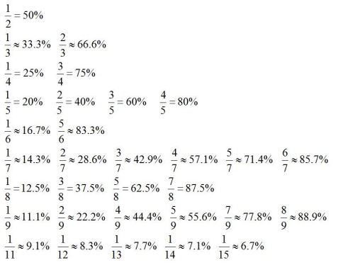 特征數(shù)字法就是利用百分?jǐn)?shù)和分?jǐn)?shù)之間的相互轉(zhuǎn)化,將列式中的百分?jǐn)?shù)近似地轉(zhuǎn)化成一些特定的分?jǐn)?shù),從而達(dá)到簡化計(jì)算的一種方法。