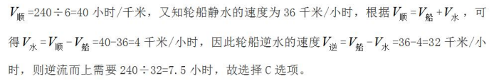 【例題1】A、B兩港相距240千米,一艘輪船從A港出發(fā)順流而下,用了6小時到達B港。若靜水中輪船的速度為36千米/小時,則這艘輪船從B逆流而上到A港需要多長時間?( )
