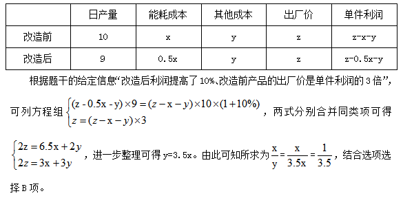例2:為降低碳排放,企業(yè)對生產(chǎn)設備進行改造,改造后日產(chǎn)量下降了10%,但生產(chǎn)每件產(chǎn)品的能耗成本下降了50%,其他成本和出廠價不變的情況下每天的利潤提高了10%。已知單件利潤=出廠價—能耗成本—其他成本,且改造前產(chǎn)品的出廠價是單件利潤的3倍,則改造前能耗成本為其他成本的:( )