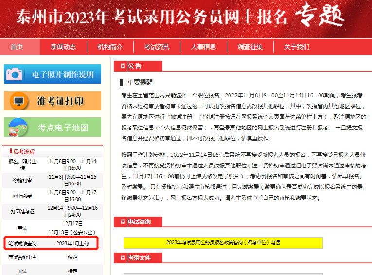 不過,近日泰州市的公務員錄用專題中關于筆試成績查詢的時間已經(jīng)從1月中旬改為了1月上旬,如下圖所示: