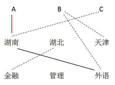 【例2】某宿舍有A、B、C三人,一個(gè)出生在湖南,一個(gè)出生在湖北,一個(gè)出生在天津,他們所學(xué)的專業(yè),一個(gè)是金融,一個(gè)是管理,一個(gè)是外語(yǔ)。已知: