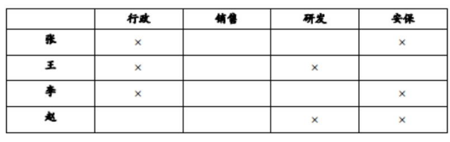 【例1】大學(xué)畢業(yè)的張、王、李、趙4人應(yīng)聘到了同一家大型公司,每人負(fù)責(zé)一項(xiàng)工作。其中一人做行政管理,一人做銷售,一人做研發(fā),另一人做安保。已知: