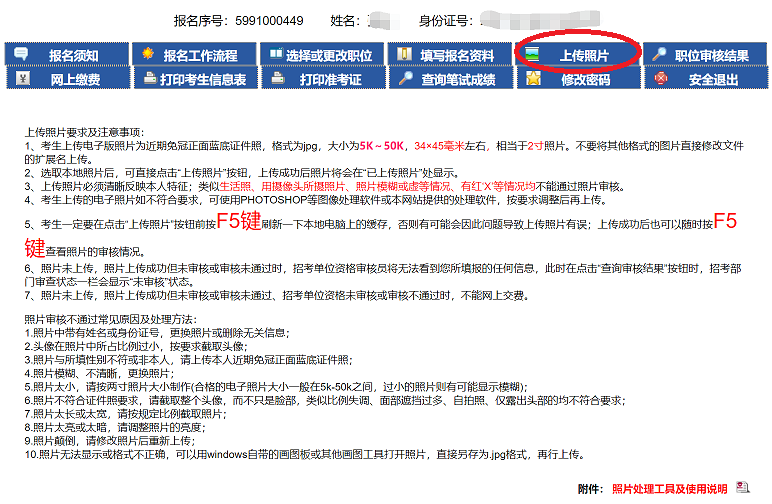 1、點(diǎn)擊‘照片上傳’進(jìn)入照片上傳界面,上傳照片前請(qǐng)?jiān)敿?xì)閱讀‘上傳照片要求及注意事項(xiàng)’如圖4-1。
