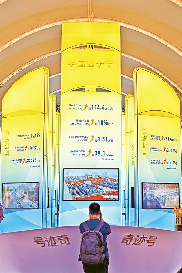 2022年10月8日,觀眾在“奮進(jìn)新時(shí)代”主題成就展中央綜合展區(qū)內(nèi)拍攝中國(guó)經(jīng)濟(jì)“奇跡號(hào)”巨輪模型。新華社記者李鑫/攝