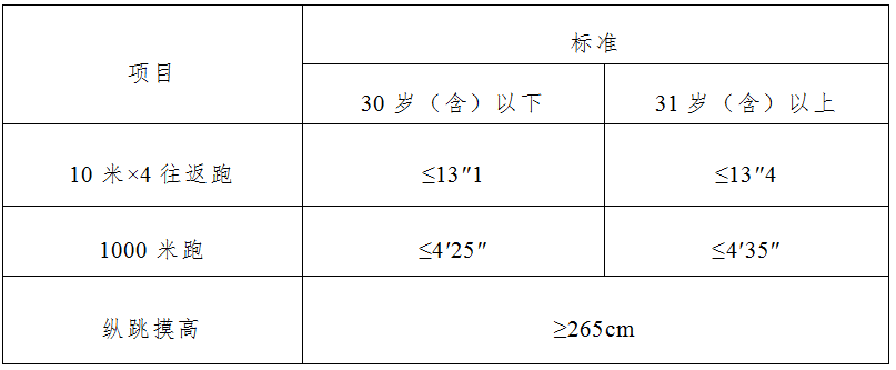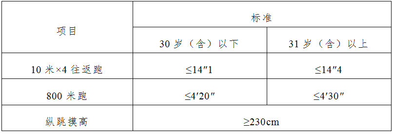 在體能測(cè)評(píng)中,男子1000米跑、女子800米跑項(xiàng)目測(cè)評(píng)次數(shù)均為1次,10米×4往返跑項(xiàng)目測(cè)評(píng)次數(shù)不超過2次,縱跳摸高項(xiàng)目測(cè)評(píng)次數(shù)不超過3次??忌跍y(cè)評(píng)10米×4往返跑前,可以練習(xí),熟悉規(guī)則。體能測(cè)評(píng)的三個(gè)項(xiàng)目中有任何一項(xiàng)不合格或違規(guī),視為體能測(cè)評(píng)不合格。