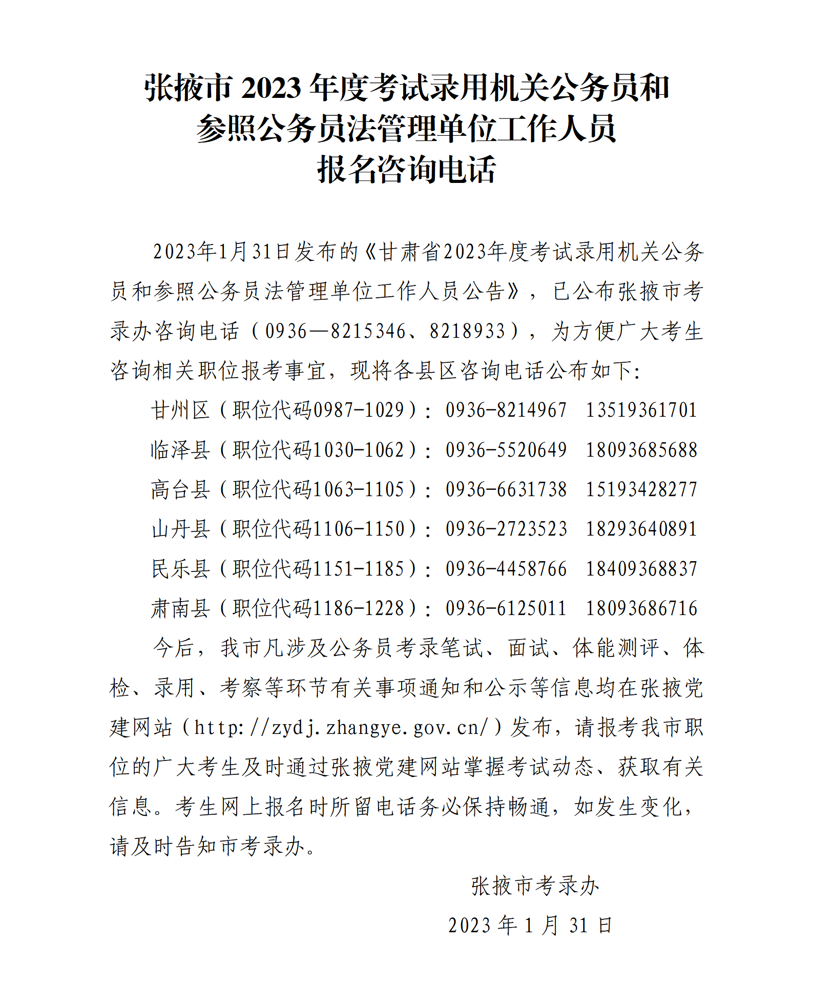 2023年甘肅張掖市公務(wù)員考試報(bào)名咨詢電話
