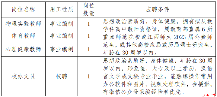 筆試面試:教師崗位,根據(jù)崗位性質(zhì),筆試采用做高考模擬試題方式,面試采用說課或現(xiàn)場演示方式;筆試面試于2月下旬擇日進行。文員崗位,筆試采用現(xiàn)場文稿寫作方式,面試采用現(xiàn)場實踐操作方式。合格者,履行錄用簽約手續(xù)。