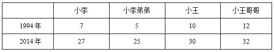 根據(jù)“在1994年,小李的弟弟和小王的年齡之和為15”,有x-2+x+3=15,解得x=7。進(jìn)而可知1994年和2014年四人的年齡情況: